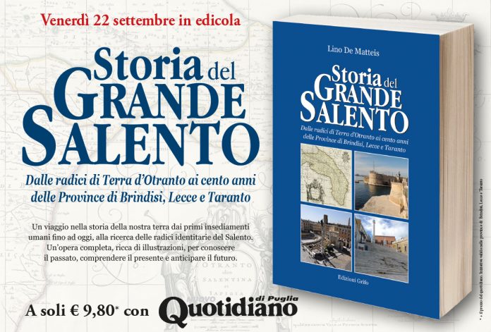 Dal 22 settembre, in promozione a costo ridotto con il Nuovo Quotidiano di Puglia, sarà nelle edicole delle province di Brindisi, Lecce e Taranto il nuovo lavoro di Lino De Matteis “Storia del Grande Salento Dalle radici di Terra d’Otranto ai cento anni delle Province di Brindisi, Lecce e Taranto” (Grifo Edizioni). Un viaggio nella nostra terra, dai primi insediamenti umani fino ai nostri giorni, alla ricerca delle radici identitarie del Salento. Un’opera completa, ricca di illustrazioni, per conoscere il passato, comprendere il presente e guardare al futuro di questo territorio.